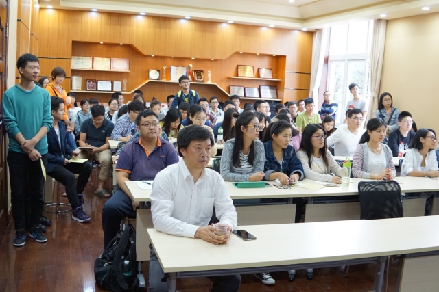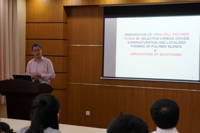 胡国华介绍了聚丙烯开孔发泡材料的制备与应用,强调指出此类材料不仅可以用在汽车制造业中使其轻量化,减少环境污染,而且还具有很强的吸油性,可进行油水处理。他还结合自身经历,用幽默的话语以及生动的实例告诉学生要想深入进行科学研究,第一就是要对周围充满好奇心,其次大胆的提出假设,然后进行深思,建立理论模型,最后再去验证。