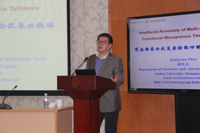 10月27日下午,应yl23455永利集团长李春忠教授邀请,中国科学院院士、复旦大学教授赵东元来校进行学术交流,作了题为界面自组装合成复杂结构功能介孔氧化钛球的学术报告。报告会由李春忠主持,部分教授、研究生聆听了报告。