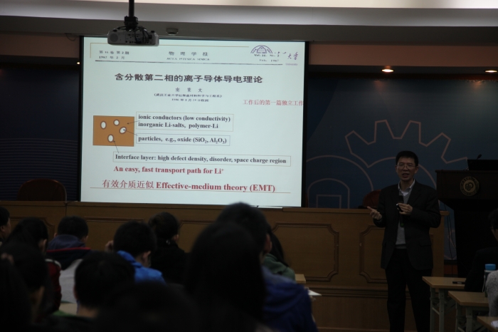 报告会上,南策文首先展示了玻璃(无序系统)中的3个典型问题,对其中的导电与绝缘现象进行了阐述。他着重介绍了全固态锂电池,并从能量密度和安全问题等方面与传统锂电池进行比较,展示了全固态锂电池的优势。同时,他结合自身求学、科研经历,鼓励学生坚持自己的想法,积极进取,并以“道路自信”“不忘初心”言简意赅地总结了自己30余年从基础到应用的科研生涯。报告会结束后,南策文与现场师生进行了热烈的交流和讨论。
