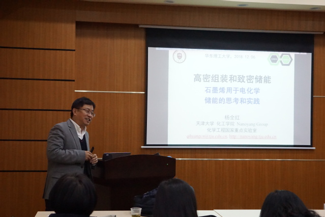 12月6日下午,国家杰出青年科学基金获得者、天津大学化工学院杨全红教授来校访问,并作了题为“高密组装和致密储能——石墨烯用于电化学储能的思考和实践”的精彩报告。会议报告由材料学院院长李春忠教授主持,来自材料学院的师生参加了报告会。