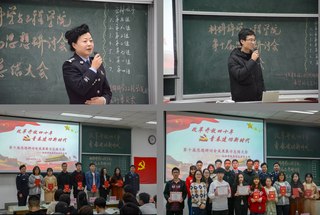 3月17日晚,材料学院第十届思想研讨会总结大会于奉贤校区A教202举行。材料学院党委副书记戴诚安、海湾高校派出所高梅香教导员和张志荣警官、资环学院党建指导教师王青、材料学院各年级辅导员、学生党员、入党积极分子、群众等近200人参加,此次活动也是材料学院与海湾高校派出所党建共建系列活动之一,活动由奉贤校区学生党员周涛主持。