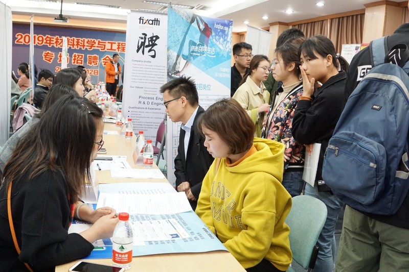 招聘会正式开始前,不少学生就来到会场与用人单位进行交流,积极投递简历。现场除材料学院本科毕业生和研究生外,化工学院等其他理工科学院的毕业生以及一些寻找实习机会的大三学生也闻讯从奉贤赶来参加。