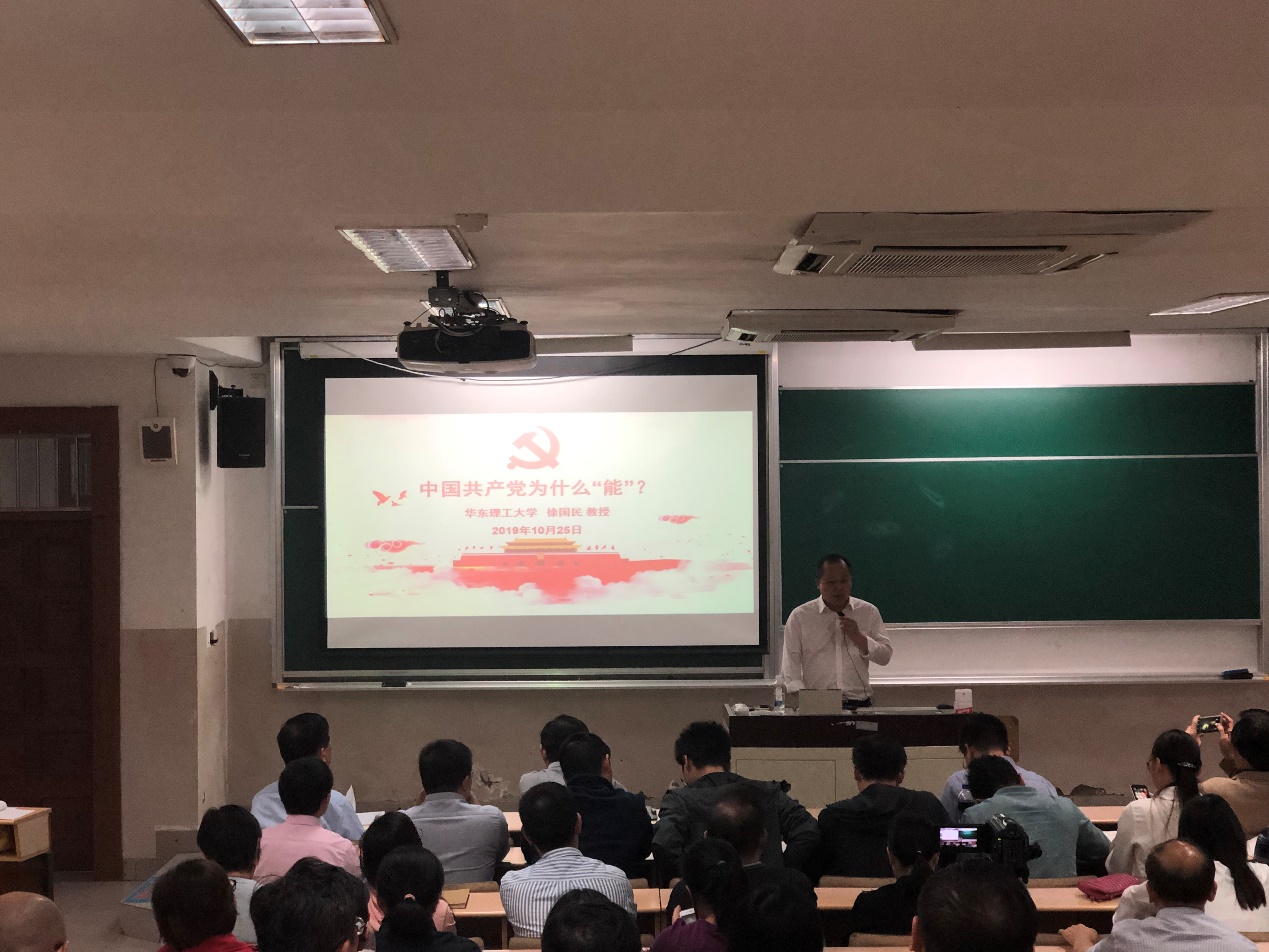 随后,徐国民教授应邀作题为“中国共产党为什么“能””的专题辅导报告。徐国民首先从中国数千年的历史发展进程、中国的文化和国情分析得出:民族团结,国家统一是历史发展的主流,只有中国共产党,这个代表中国最广大人民的根本利益的先进政党才能带领全国人民进行社会革命,走向繁荣富强。中国共产党的先进性和纯洁性使它能成为始终走在时代前列、经得起各种风浪考验、朝气蓬勃的马克思主义执政党。接着,徐老师指出我国正处于并将长期处于社会主义初期阶段,我们要按照习近平总书记的要求,深刻认识和准确把握外部环境的变化和我国改革发展稳定面临的新情况新问题新挑战,要始终保持忧患意识,不断全面从严治党。为决胜全面建成小康社会、夺取新时代中国特色社会主义伟大胜利、实现中华民族伟大复兴的中国梦提供坚强保障。