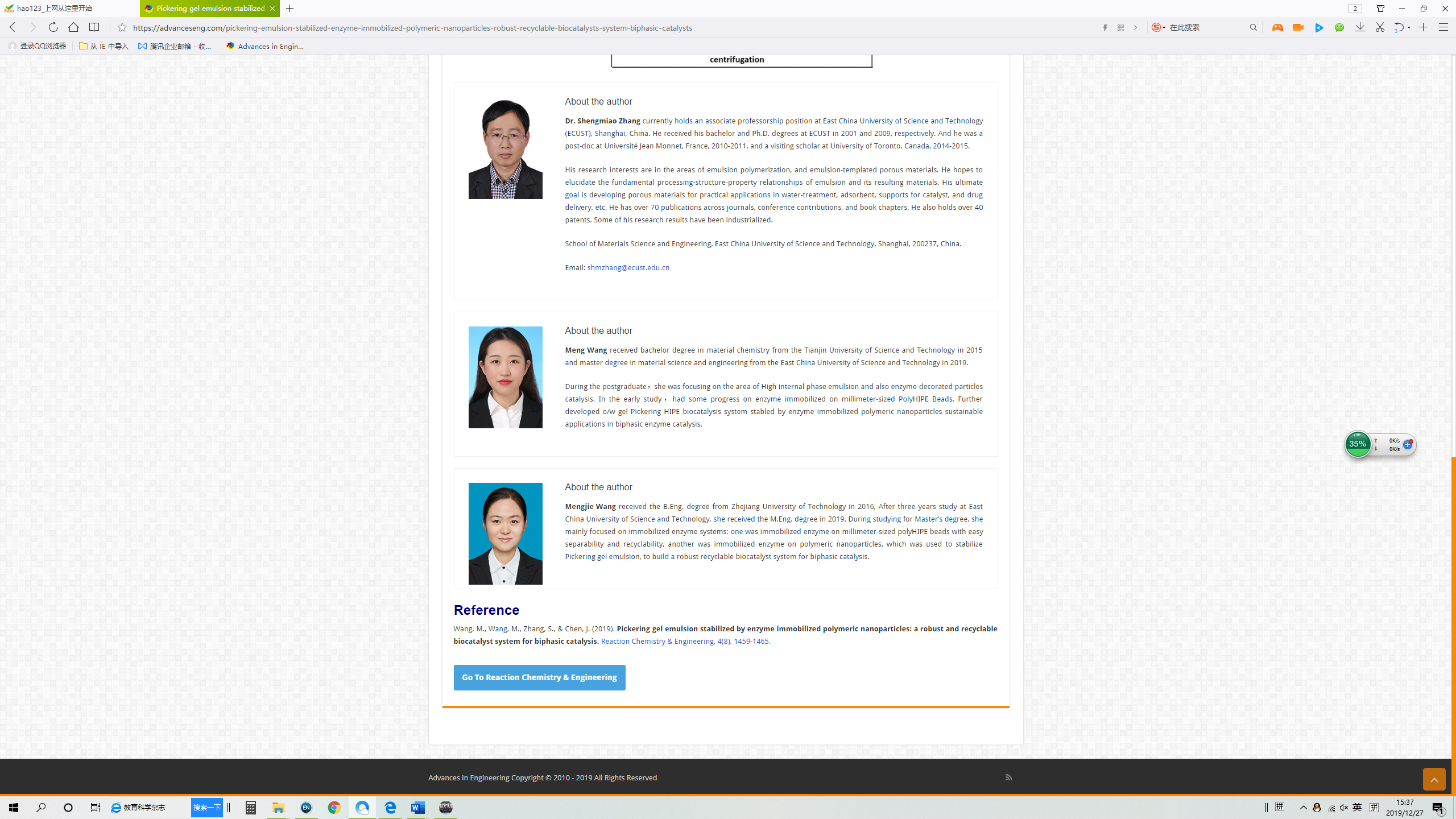 Advances In Engineering编辑对此研究成果高度评价:章圣苗和他的研究团队通过开发一种高效的Pickering两相界面生物催化系统,从体积比、稳定性、可回收性和总体运行成本等方面有效促进两相催化的可持续应用。(The study by Professor Shengmiao Zhang and his research team will advance sustainable applications of biphasic catalysis by developing a highly efficient Pickering interfacial biocatalytic system in terms of volume ratio, stability, recyclability, and overall operating costs.)。除对上述成果详细报道外,Advances In Engineering网站还专门以图文方式详细介绍了章圣苗的科研经历。