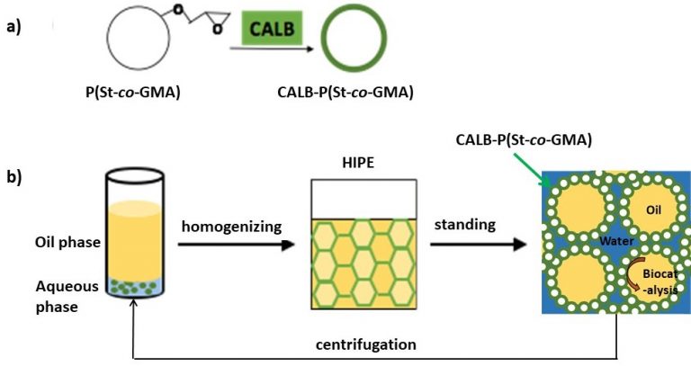 针对上述关键问题,章圣苗课题组研制了一种酶修饰共聚纳米粒子稳定的Pickering凝胶乳液(亦称高内相乳液),用于两相酶催化。成功地将Pickering高内相乳液(HIPEs)应用于两相酶催化体系,解决了两相酶催化反应的高通量、稳定性和可回收循环利用之间的平衡问题。作者通过苯乙烯和甲基丙烯酸缩水甘油酯的无皂乳液聚合制备了一种脂肪酶假丝酵母南极脂肪酶(CALB)修饰的聚合物纳米粒子;将反应底物的有机溶液分散于该纳米粒子水分散液中,形成水包油型Pickering 高内相乳液。将Pickering凝胶体系静置于室温下,即可完成反应。对己酸与正己醇在油相中的酶酯化反应催化效率分析表明,在Pickering凝胶乳液中,纳米颗粒上的固定化CALB比游离CALB具有更高的酶活性。酶促反应后,仅通过低速离心,即可破乳,进而实现反应产物油溶液和固定化酶的水分散液的分离。将新的反应底物油溶液再次和固定化酶的水分散液简单混合,又可形成新的Pickering 高内相乳液两相酶催化反应体系。这一过程可多次重复,10个反应循环后的酶活性仍然保持92.5%以上。该成果发表于英国皇家化学会(RSC)旗下的 Reaction Chemistry & Engineering, 2019, 4(8), 1459-1465.