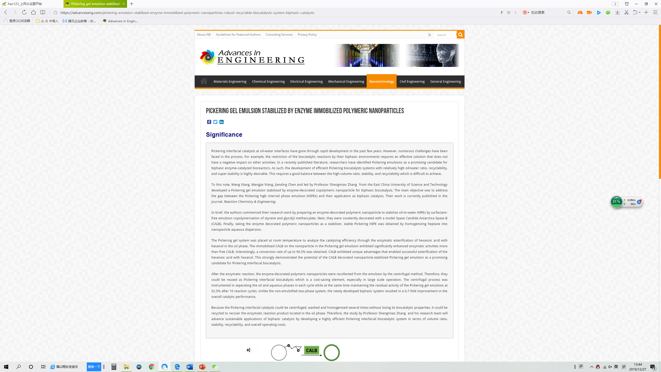 近日,国际著名工程学网站“Advances in Engineering”(简称AIE)公开报道了我校yl23455永利集团章圣苗副教授课题组在酶固定化聚合物纳米粒子稳定的Pickering凝胶乳液两相酶催化体系的研究成果。
