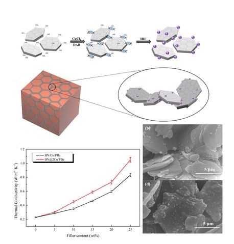 吴唯教授课题组通过Cu2+的原位还原,实现了在二维氮化硼(BN)片层对零维纳米Cu球的负载,制备出全新的BN@Cu杂化填料。由于这种BN@Cu杂化填料特殊的结构特征,一方面提高了填料表面粗糙度,二维BN填料表面因零维纳米Cu球的凸起更易形成稳定的导热网络。另一方面增大了填料与基体间接触面积,使热量从聚合物基体以声子传递形式经二维BN平台作用再通过纳米Cu球传导提供了更通畅的通道,减少了声子散射。二者共同作用的结果,有效提高了聚合物的热导率。通过对不同负载量下杂化填料对聚合物导热性能的研究,获得了对构建导热网络最为有效的填料结构,将聚合物导热系数提高了500%。这类新型杂化导热填料相对于单一导热填料而言,不仅在构建导热网络的能力上体现出明显优势,还能大幅降低接触热阻,对提高聚合物导热性能研究具有重要的科学意义及应用价值。