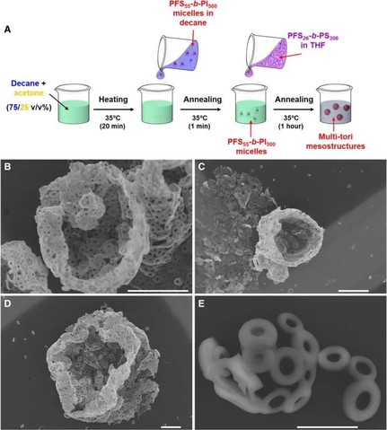 通过对多圆环结构形成过程的动力学研究,证明此自组装体的形成遵循独特的途径,并且PFS嵌段的结晶过程在此过程种起着决定性作用。图2为3D多圆环结构形成机理的示意图。首先,嵌段聚合物会自组装成微米级的囊泡结构,在没有晶种的条件下,得到无定形膜。但在PFS55-b-PI500晶种存在时,PFS-b-PS的自组装被限制在囊泡内,最终得到环形的结构。同时,在此混合溶剂中加入第三种溶剂,此介孔组装体的形态也会发生变化,可得到球形度更高的介孔结构,或者形成多环薄膜等。该溶液组装的过程证明了利用CDSA来制备新型复杂功能材料的巨大潜力,同时也为利用自下而上的组装方案来制备更多复杂结构的组装体提供了新方法。