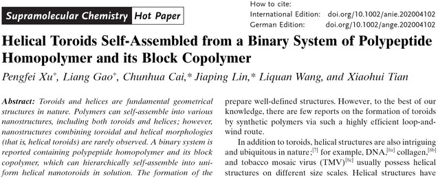该工作由材料学院博士生徐鹏飞、青年教师高梁在蔡春华教授和林嘉平教授的指导下完成,相关工作以”Helical Toroids Self-Assembled from a Binary System of Polypeptide Homopolymer and Its Block Copolymer”为题发表在Angew. Chem. Int. Ed. (DOI: 10.1002/anie.202004102),并已入选Hot Paper。