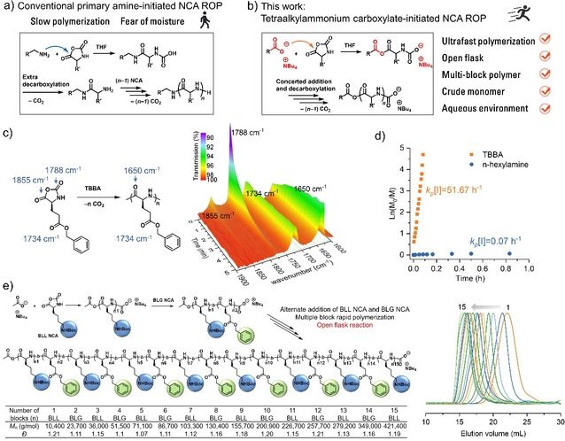 刘润辉教授课题组前期报道了六甲基二硅基胺基锂 (LiHMDS) 可引发对水分不敏感的NCA超快速聚合 (Nat. Commun. 2018, 9, 5297) 。在本研究中,该课题组发现羧酸盐可作为一类新的引发剂,引发超快速NCA聚合,实现高效便捷地制备多肽聚合物。动力学研究发现,相同条件下四烷基铵羧酸盐引发NCA聚合速率是伯胺的700倍以上。新型引发剂还可在敞口环境下实现快速制备具有至少15个嵌段单元的多嵌段共聚物。此外,该策略可避免繁琐的单体纯化步骤,即使在水相环境中使用未提纯NCA单体也可以实现超快速聚合,因此这一聚合策略在多肽聚合物相关功能探索和应用方面具有巨大潜力。