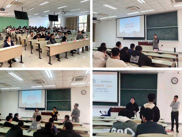 在高分子材料专业导航专场,徐彬彬以“智能高分子的设计与应用”为主题,为到场学生介绍了高分子材料的历史和发展。从最初的硫化橡胶性能到如今高分子学科的蓬勃发展,阐述了高分子学科对于推动人类文明发展的意义。此外,还介绍了所在课题组团队基本情况,包括成员组成、实验室条件以及最新科研成果。靳海宝和陶鑫峰从个人学业经历出发,讲述了本科生应该如何做好人生和未来职业发展的规划,希望同学们明确方向、规划未来,欢迎新生前往课题组实验室参观。