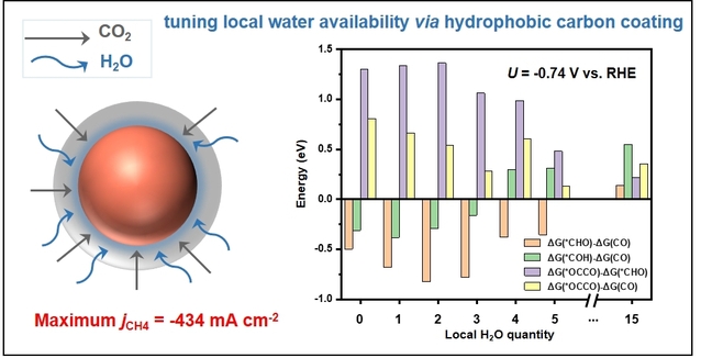 针对这一关键问题,研究团队提出调节催化剂表面水覆盖度提升深度还原产物的研究方法。通过密度泛函理论计算结果证明,与竞争性的*CO脱附和C-C耦合过程相比,在局部水浓度较低的铜表面上利于促进CH4生成;进而可控制备出具有疏水性的碳包覆铜核壳结构,降低了催化剂表面的水覆盖度。该催化剂在CO2还原工况环境下可以保持疏水性,催化剂的CH4局域电流密度最高可达434 mA cm-2,CO2至CH4的最高转化速率达到0.56 μmol·cm-2 s-1,是目前报道的二氧化碳甲烷化性能最优的电催化剂之一。该研究工作为CO2电化学合成深度还原产物提供了一个新的视角。