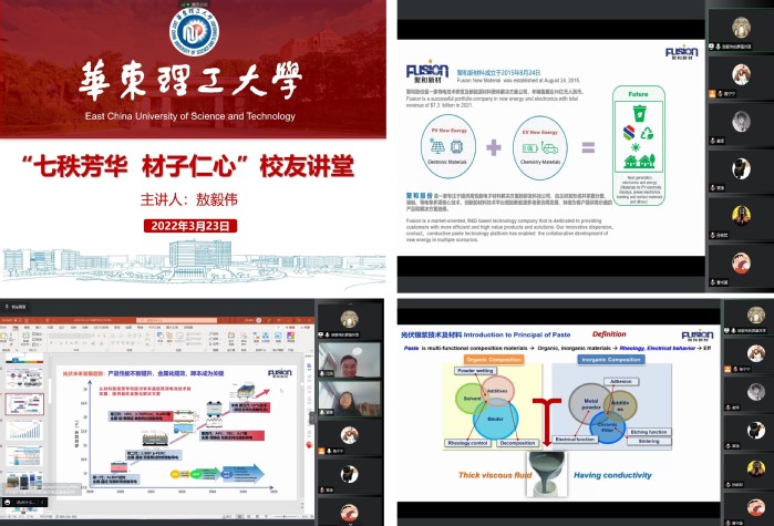 2022年是华理70周年校庆,华理校园正经历一场特殊的战“疫”,为保障疫情防控期间学院各项工作有序进行,材料学院开展“七秩芳华 材子仁心”校友讲堂,凝聚校友力量,同心战“疫”。3月23日下午,常州聚和新材料股份有限公司(以下简称“聚和股份”)董事、研发副总敖毅伟受邀作《功能材料在光伏新能源及电子行业的应用》线上主题报告。本次活动有260余名师生线上积极参加,活动由材料学院教授江浩主持。