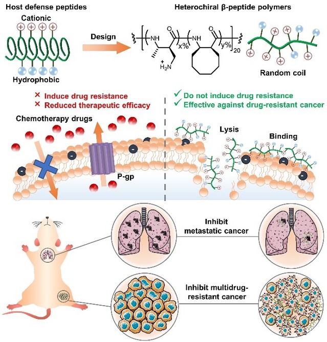 近日,我校材料学院刘润辉教授课题组在治疗耐药肿瘤研究中取得了突破成果,以β多肽聚合物模拟宿主防御肽发现了高效抗耐药肿瘤功能。该成果以“Heterochiral β-Peptide Polymers Combating Multidrug-Resistant Cancers Effectively without Inducing Drug Resistance”为题发表在《美国化学会志》(J. Am. Chem. Soc. 2022, DOI: 10.1021/jacs.2c00452)