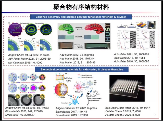 朱锦涛教授围绕“嵌段共聚物的三维受限组装”主题,先后向大家介绍了聚合物有序结构材料应用、聚合物自组装体系的共性问题和嵌段共聚物的受限组装分类等相关领域内的热点话题。朱锦涛教授阐释了两条重要结论:界面调节与软受限组装协同调控聚合物有序结构以构建中性界面和响应性界面,实现聚合物微球材料形状/结构的可控调节;基于聚合物受限组装构建多层次有序结构,可获得具有可控光学与药物释放性能的聚合物微结构材料。
