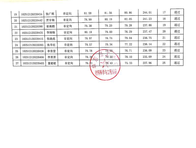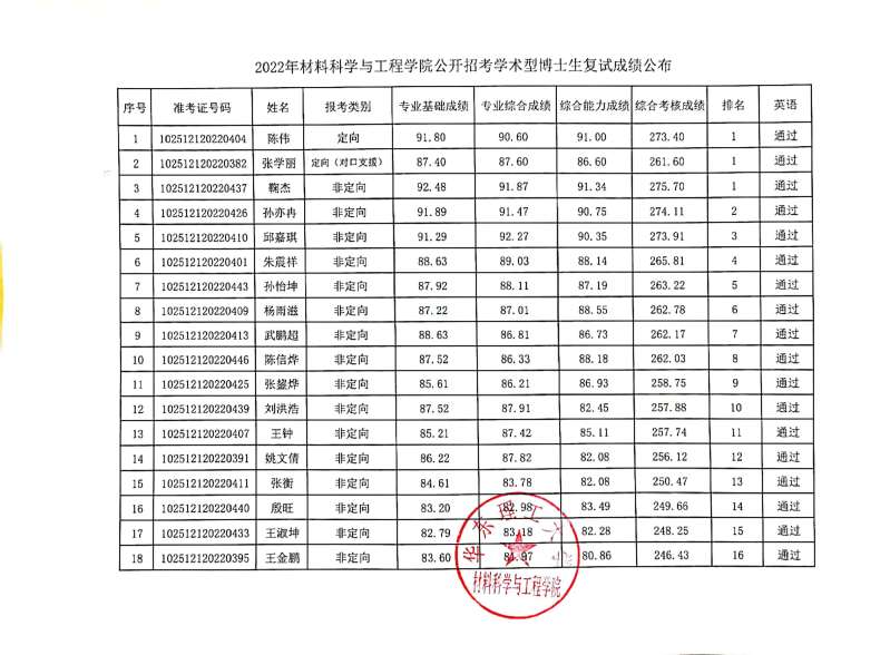 2022公开招考学术型博士生成绩公布-材料学院