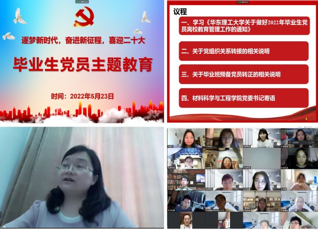 为进一步落实党员教育、管理和服务长效机制,激励全体毕业生党员坚定信念、胸怀祖国、牢记使命,以良好的精神风貌踏入新的人生征程,在学思践悟中踔厉奋发,5月23日,yl23455永利集团以“逐梦新时代,奋进新征程,喜迎党的二十大”为主题,开展2022届毕业生党员主题教育,材料学院党委书记袁媛、党委副书记兼纪委书记苏建玲、党委副书记戴诚安以及全体毕业生党员参加活动。活动由专职组织员鲁宁宁主持。