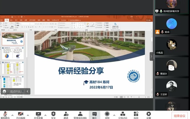 6月17日晚,材料学院组织召开线上保研考研经验分享会,本次交流会邀请了2018级在保研考研中取得优秀成果的学长学姐们交流心得体会,分享宝贵经验。学院就业辅导员贾维华老师,年级辅导员李廷雨老师和一百余名学生参加了此次经验分享会。