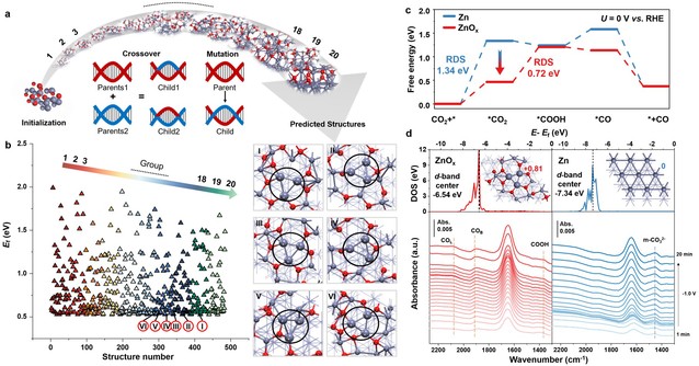 研究团队利用基于遗传算法的全局优化方法,进一步从原子尺度深入探究了Zn2P2O7预催化剂在CO2RR工况环境下的真实活性位点。通过对Zn基催化剂的真实活性结构(具有非化学计量比的ZnOx)进行了预测与模拟,筛选出一类具有稳定局域结构的类金属hollow Znδ+活性位点。密度泛函理论(DFT)进一步证明类金属hollow Znδ+活性位点可以有效地促进CO2的活化以及后续的加氢过程,大幅降低了生成CO的反应能垒;同时表面增强原位红外光谱也从实验层面证实了该活性结构对关键中间体的稳定机制。