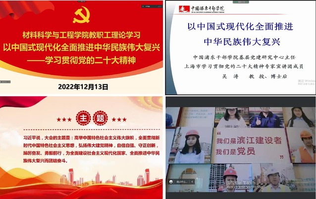 为全面准确领会党的二十大精神,进一步推进党的二十大精神走深走实,12月13日下午,材料学院邀请中国浦东干部学院基层党建研究中心主任、上海市学习贯彻党的二十大精神专家宣讲团成员吴涛教授,作题为《以中国式现代化全面推进中华民族伟大复兴——学习贯彻党的二十大精神》线上辅导报告。学院全体教职员工、部分研究生党员参会,会议由学院党委书记袁媛主持。