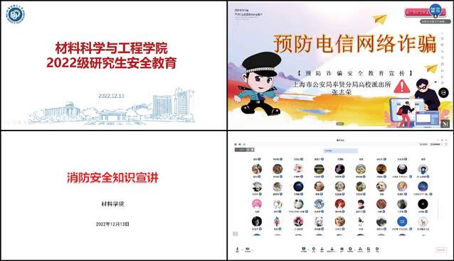 12月13日下午,材料学院邀请党建共建单位上海市公安局奉贤分局高校派出所张志荣警官和校保卫处消防安全管理岗负责人段凯洋对2022级研究生进行安全专题教育。讲座通过线上方式进行,由学院研究生新生辅导员娄梦蝶主持。