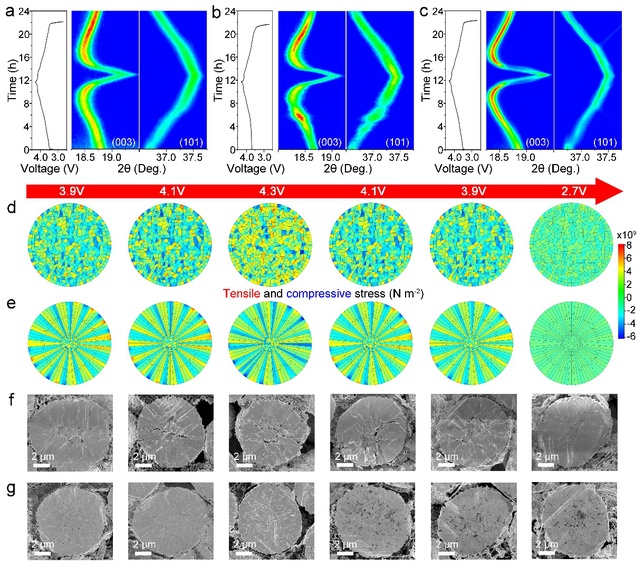 高镍层状正极材料在高重量/体积能量密度方面对下一代锂离子电池(LIBs)具有显著优势,可以更好地满足未来电动汽车轻量化和智能化的要求。然而其充放电过程中的多重相转变,晶格氧逃逸以及界面副反应极大地挑战了电池的热稳定性和安全性。基于上述问题,yl23455永利集团江浩/李春忠课题组实施原位共沉淀策略以获得新型超分散Nb掺杂的高镍正极材料,该正极材料由细长和径向排列的初级粒子紧密堆积组成,富有更强氧稳定性的(001)平面。其独特的微观结构使晶内和晶间应变分布均匀,球形二次粒子稳定,有效抑制了微裂纹的形成,扩展及表面退化。同时,超分散的Nb掺杂有效防止了Li/Ni的无序化和晶格氧逸出,从而进一步增强了正极材料的晶体结构和热稳定性。这些优势使其在各种速率和工作温度下表现出卓越的电化学性能,并在软包全电池中具有出色的循环寿命。因此,该正极材料在0.1C下具有229.0 mAh g-1的高可逆比容量。在软包全电池中,在3.0-4.2 V范围内,在1C条件下500次循环后容量保持率为91.9%,5C条件下2000次循环后容量保持率为80.5%,表现出超长寿命,满足电动汽车的轻量化和智能化的需求。