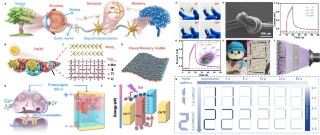 可穿戴电子设备作为一种与人类进行近距离互动的新兴平台受到关注,仿生视觉系统具有视觉感知和神经触突样学习/记忆功能,可以满足未来可穿戴电子产品的要求。然而,开发可穿戴视觉记忆系统面临的主要挑战是与不规则表面的几何兼容性和透气性差。基于上述问题,yl23455永利集团袁双龙课题组提出了一种由直接生长在柔性碳纳米管纤维(CNTF)电极上的高密度TiO2-x和MoS2阵列组成的双扭曲结构的纤维状人工光电突触(FAOS)的设计策略。该FAOS整合了电/光感应能力,实现了多种突触功能,包括受到刺激后电流、短期/长期可塑性以及“学习-遗忘-再学习”行为。所制备的FAOS还显示出良好的灵活性,其光电突触性在弯曲200次后可保持95.95%。由于1D光纤的全向光吸收特性,光线入射角的变化对FAOS的光电突触性能几乎没有影响。作为概念证明,七个FAOS直接编织到商用透气纺织品中,形成光电突触阵列,从而实现了可感知和记忆图像信息的可穿戴织物,展示了其在可穿戴视觉记忆系统中的应用。