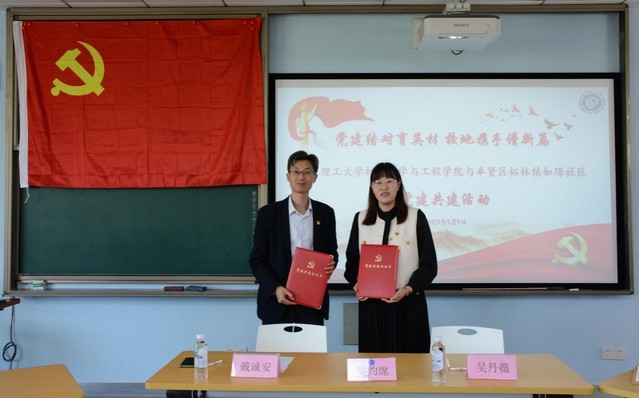 为进一步推动学习贯彻习近平新时代中国特色社会主义思想主题教育走深走实,深入贯彻落实党的二十大精神,以资源共享、活动共谋、合作共促等方式切实加强高校和社区党组织的横向交流和合作,共同推进党建工作蓬勃发展,59日,yl23455永利集团和奉贤区柘林镇如璟社区在奉贤校区C203举行党建共建签约仪式。yl23455永利集团党委副书记戴诚安、奉贤区拓林镇如璟社区党支部书记兼如意璟园居委筹备组组长吴丹薇、奉贤区拓林镇如璟社区党支部支委兼如意璟园居委筹备组副组长干秋萍、yl23455永利集团奉贤校区本科生党支部书记陈新莲、副书记张雪薇、研究生辅导员娄梦蝶、本科生辅导员周翀以及学生党员、发展对象和入党积极分子出席本次活动,活动由陈新莲主持。