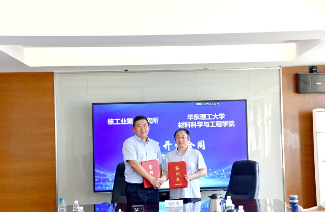 图片说明:中核八所所长助理、复合材料技术中心主任沈伟与材料学院教师姜海波签署技术开发合同