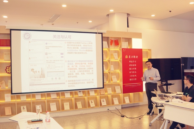 随后师生党员代表,从不同年龄梯度和工作视角,围绕基因驱动高性能树脂创制进行交流分享。高梁从高分子材料基因组工程的概念,高分子材料基因组研发平台创建历程,树脂结构性能数据库、基团化学反应数据库、聚合物材料性能预测,高分子材料基因组研发平台在国内外的关注与认可情况等进行了介绍,目前在新华社、央视新闻、央广网、Twitter等相关阅读报道已经超1000万人次。他提到,要发挥高分子材料基因工程的引领作用,加强材料学与信息学的交叉合作,推动材料研发方式变革。作为青年教师,要传好“接力棒”,不能“起个大早、赶个晚集”。学生张振涛、徐添豪从研究生工作人员的视角,分享了参与高分子材料基因组研发平台创建的故事和个人感想。