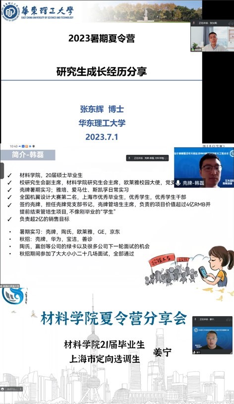 优秀校友分享会环节,特聘副研究员、上海市扬帆计划获得者张东辉,原校研究生会副主席、现就职壳牌(中国)有限公司韩磊、原材料学院研究生会主席姜宁结合自身在华理工作和学习经历,与营员们分享了导师选择、科研攻克、实习就业等方面的心得与体会,加深了营员们对攻读材料学院研究生的浓厚兴趣。