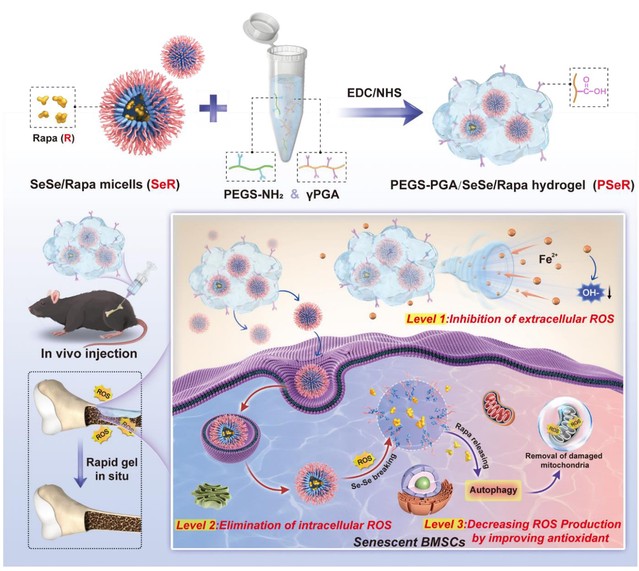 随着全球老龄化人口的增加,由骨稳态失衡和再生能力衰退引起的老年性骨损伤已成为公共卫生保健面临的重大医学挑战。能够改善衰老的微环境和衰老的干细胞从而恢复衰老骨再生的干预措施是治疗老年性骨缺陷的一种潜在治疗方法。近日,我校刘昌胜院士,袁媛教授和张琰教授课题组报道了一种负载含雷帕霉素的聚二硒化物胶束的可注射聚乙二醇化甘油癸二酸酯/聚谷氨酸水凝胶(PEGS-PGA/SeSe/Rapa,PSeR),用于多维度调控老龄骨再生微环境的活性氧(ROS)水平,恢复老龄骨组织的再生潜能。这一研究成果以题为“Rejuvenating aged bone repair through multihierarchy reaction oxygen species-regulated hydrogel”发表在Advanced Materials上。
