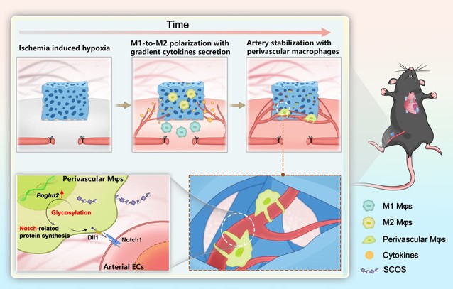近日,我校刘昌胜院士和王靖教授课题组在原位组织再生过程高效诱导功能性血管的研究中取得了新的进展。发现类肝素磺化壳寡糖(SCOS)调控宿主巨噬细胞诱导动脉血管新生的新规律,实现了在下肢缺血及心梗等急性缺血性疾病中动脉血管的快速诱导长入及有效治疗。这一研究成果以题为“Sulfated oligosaccharide activates endothelial Notch for inducing macrophage-associated arteriogenesis to treat ischemic diseases”发表在PNAS上。
