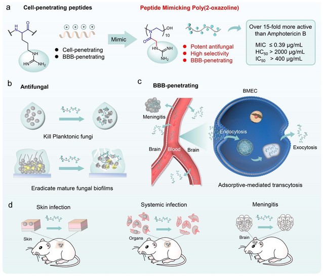 中枢神经系统的侵袭性真菌感染通常与难以接受的高死亡率相关,每年约有22万隐球菌脑膜炎病例,18万多人死亡。然而,大多数抗真菌药物穿透血脑屏障(BBB)的能力较差,治疗脑膜炎的疗效不佳。目前解决侵袭性真菌感染和脑膜炎的挑战主要在于两个方面:发现高效、低毒且不易产生耐药性的化合物;同时提高化合物对血脑屏障的穿透能力。尽管付出了巨大的努力来研究高效、低毒的抗真菌化合物,但进展缓慢。此外,已经探索了许多方法来打破血脑屏障的限制,其中细胞穿透肽(CPPs)修饰被认为是一种有前途的方法,但由于偶联反应的复杂性、偶联物纯化困难以及抗真菌效力的降低,导致该策略在脑膜炎治疗应用上受到了阻碍。因此,迫切需要有效的抗真菌化合物设计策略,以满足高效抗真菌活性、高选择性和穿透血脑屏障的多方面需求。刘润辉教授课题组在前期研究中发现了模拟CPPs聚精氨酸可获得高效抗真菌聚合物(Angew. Chem. Int. Ed. 2022, 61, e202200778)。考虑到CPPs可以用于脑部递送,本研究进一步探索CPPs模拟策略,通过引入高密度胍基和调节间隔臂结构来改善聚合物的抗真菌性能和对血脑屏障的穿透性,解决真菌脑膜炎治疗中的长期挑战。最优聚合物在体内外均表现出高效的抗真菌活性和血脑屏障穿透效率,实现了对包括脑膜炎在内的多种耐药真菌感染的治疗效果,为研究脑部治疗药物提供了新思路。
