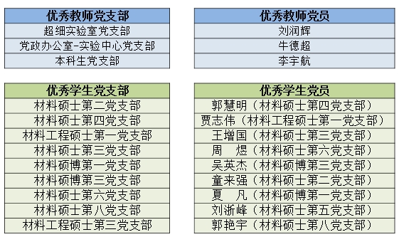 两场考评会由学院党委委员、教师代表担任评委。经无记名打分,超细实验室党支部等3个教师党支部、材料硕士第二党支部等9个学生党支部,刘润辉等3位教师党员、郭慧明等9位学生党员获得年度优秀。
