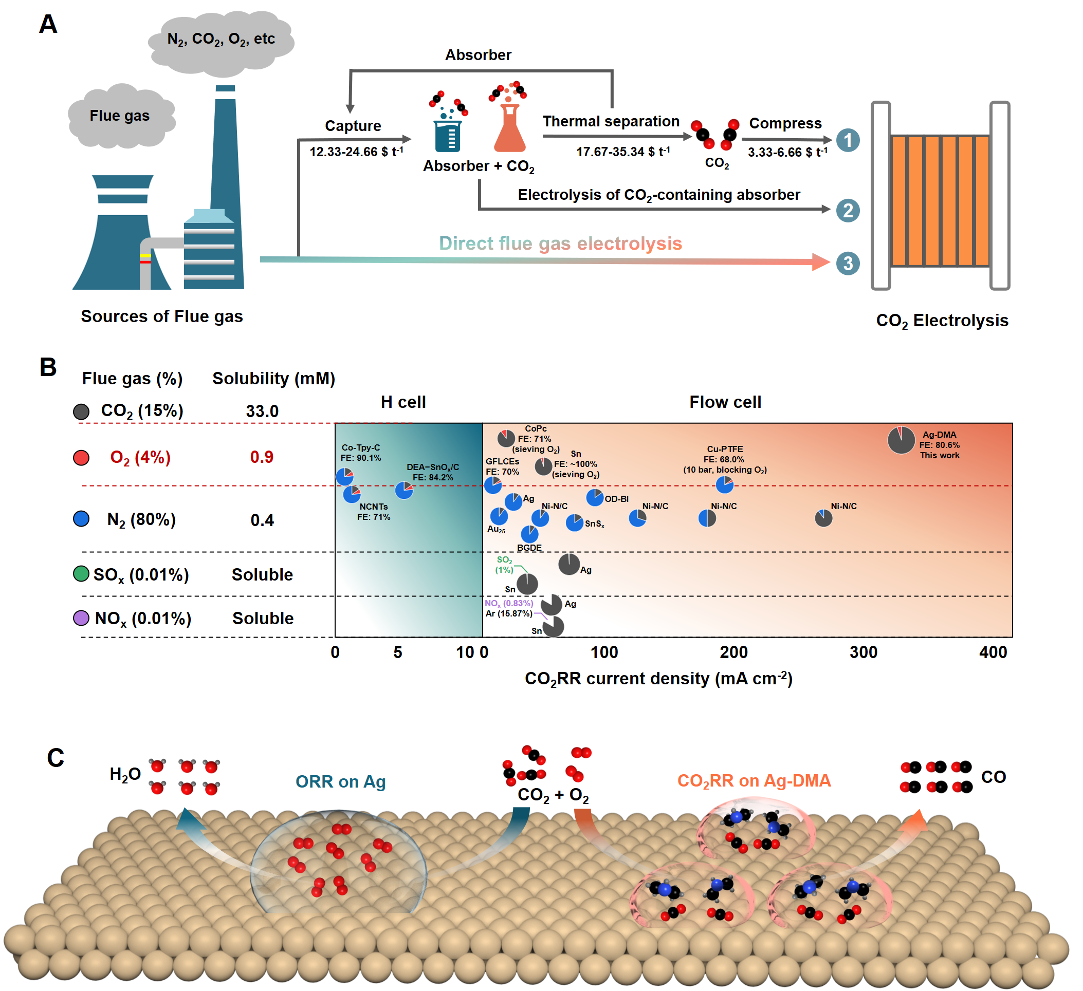 烟道气的主要成分为N2,O2,CO2以及少量的SOx、NOx和粉尘。然而,由于O2还原相比于CO2还原更容易发生,会严重影响CO2的电还原性能。针对这一关键问题,研究团队开发了一种用于直接模拟含氧烟道气电还原的有机胺修饰银催化剂(Ag-DMA)。纯银催化剂在烟道气中的CO法拉第效率基本为0%;相比之下Ag-DMA可实现最高80.6%的CO选择性,CO部分电流密度为333.7 mA cm-2。膜电极组件中烟道气电解可在~250 mA·cm-2下持续运行,全电池能量效率约为40%。原位光谱和计算表明,有机胺修饰不仅增强了CO2的持久吸附能力,为Ag纳米颗粒创建了局域碱性微环境,而且有效地阻碍了氧还原反应中*OOH关键中间体的形成,避免了电子用于驱动氧还原副反应。该工作表明,有机胺修饰催化剂有助于构建直接烟道气电还原的自驱动捕集-转化系统,为降低CO2进料成本、促进CO2电解产业化进程提供了广阔的应用前景。