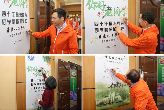 在会场内,每位校友逐个签到,其中有十余位从美国、加拿大、欧洲、澳洲飘洋过海、跨越万里相聚华理,会场内同时摆放着毕业30周年相聚时的签名牌匾,另有几位远在海外未能到场的校友通过“云直播”连线,全程参加。