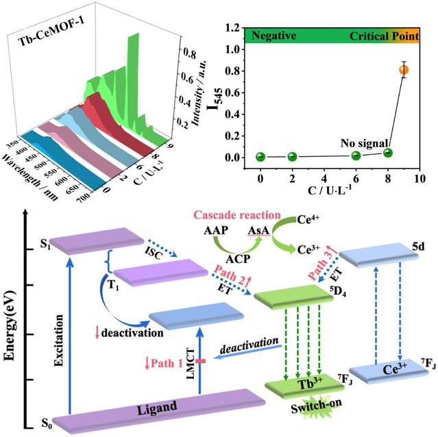 肿瘤标志物的精准检测是实现癌症早筛早诊最有效的方法之一,但其浓度在正常和病理状态之间通常波动很小,从而对癌症阴阳性的精准诊断构成重大挑战。例如,临床上,酸性磷酸酶(ACP)常被当作前列腺癌(PCa)早期筛查的一种标志物,其在血清中的浓度大于9 U·L-1即预警患癌可能。然而,目前ACP的分析主要依赖于检测信号的“逐渐”降低或增加,这种“渐变式”的检测模式难以精准区分ACP在PCa阴阳性之间的微小浓度差异,易造成假阳或假阴性的诊断结果。