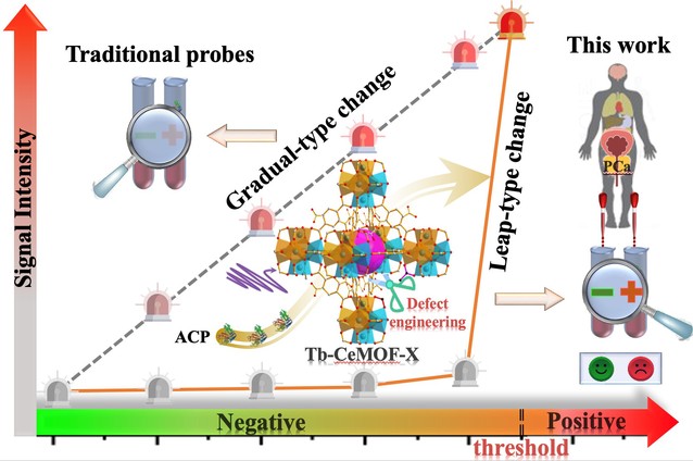 针对这一问题,研究团队通过将混合价态Ce金属中心、电荷/能量供体均苯四甲酸和发光活性中心Tb3+共组装到MOF中,利用ACP与混合价态Ce节点间的级联反应,巧妙地调控体系中荧光猝灭(配体Ce4+的电荷转移)和荧光增强(配体Tb3+、Ce3+Tb3+的能量转移)过程的此消彼长,设计合成了一种“突跃”响应型镧系MOFs荧光探针(Tb-CeMOF-X)。探针中Tb3+的发光在ACP阈值浓度(9 U·L-1)时表现出从“无”到“有”的荧光“突变”响应(即ACP浓度< 9 U·L-1时表现为荧光静默,≥ 9 U·L-1时荧光打开)。该过程就像酸碱滴定,即在滴定终点附近仅仅微量滴定剂就会引起指示剂颜色的突变。值得一提的是,探针“突跃”响应的灵敏度还可进一步通过适当增加MOF的结构缺陷得到提高。与“渐变”型探针相比,这一缺陷放大的“突跃”响应探针可以使血清中ACP浓度在PCa阴阳性之间的信号差异最大化,从而显著提高PCa早期筛查的准确性。该研究为设计高精准荧光探针用于癌症早期诊断提供了新方法和新思路。
