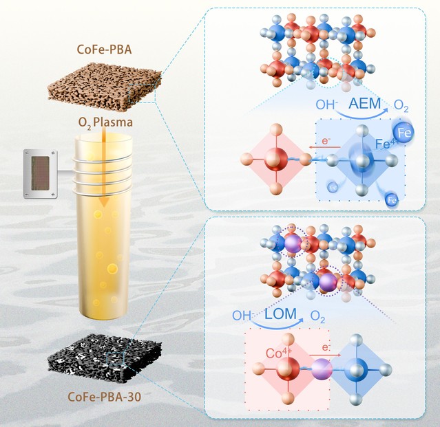针对上述问题,我校研究团队创新性地采用高功率氧等离子体处理技术,精确调控了CoFe双金属普鲁士蓝类似物(PBA)析氧催化剂的局域原子近程结构:在保留PBA晶体结构框架的同时,通过破坏局域氰基配体并引入氧原子,成功构建了Co-O-Fe的结构基元,进而将析氧反应路径从传统的吸附物演化反应机制(AEM)调节为动力学更优的晶格氧氧化反应机制(LOM)。