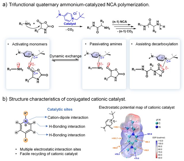 多肽聚合物广泛应用于抗菌、药物与基因递送、组织工程等领域,是一类重要的生物材料。伯胺引发NCA开环聚合一直是制备多肽聚合物的经典方法,具有原料来源广泛、结构多样等优点,但存在反应速率慢、对水分敏感、可控性差及难以合成高分子量多肽聚合物等问题。传统催化剂难以同时兼顾快速与可控聚合,且多依赖于氢键作用,其分子间与分子内氢键可能干扰催化效果。为了解决上述问题,我们迫切需要探索一种新的催化策略,以同时实现快速和可控的NCA聚合。