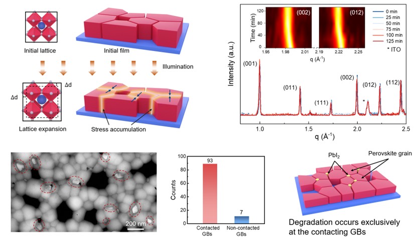 针对上述关键问题,研究团队通过实验和理论相结合的方法,研究了光致伸缩效应对钙钛矿太阳能电池稳定性的影响,率先提出了光致伸缩加速钙钛矿薄膜降解的新机制。研究发现,由光照明驱动的晶格膨胀控制着钙钛矿薄膜降解动力学,光照下的动态晶格演变造成了钙钛矿晶粒在晶界附近局部应变的积累,加速了晶界区域的缺陷形成,进而作为初始降解位点造成了钙钛矿电池的性能损失。为此,研究人员使用反式聚异戊二烯作为钙钛矿薄膜的缓冲材料,缓解了晶界处的光机械损伤。所研制的钙钛矿器件光电转换效率可达25%,并且在连续光照1000小时后保持稳定的功率输出,达到了国际先进水平。该工作强调了动态晶格变形在钙钛矿薄膜分解中的重要作用,并将为进一步提高太阳能电池的本征稳定性开辟新的可能性。
