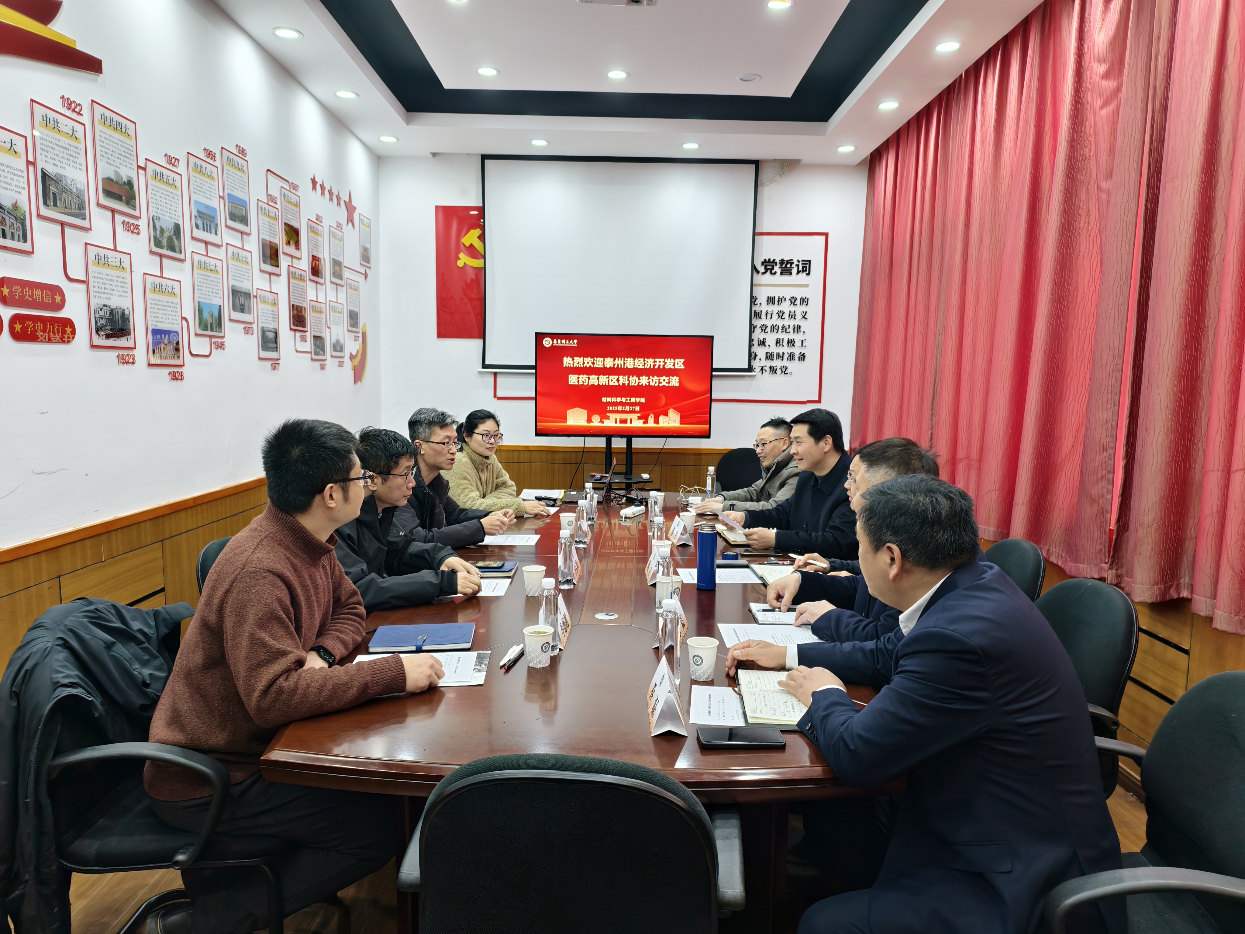 227日,江苏泰州港经济开发区管理办公室党工委委员陶立、泰州医药高新区科协副主席乔磊一行5人来访yl23455永利集团,在实验一楼第二会议室开展座谈交流。我校科学技术发展研究院副院长庄启昕,材料学院党委副书记戴诚安、院务助理牛德超、就业指导教师陈新莲参加座谈。会议由戴诚安主持。
