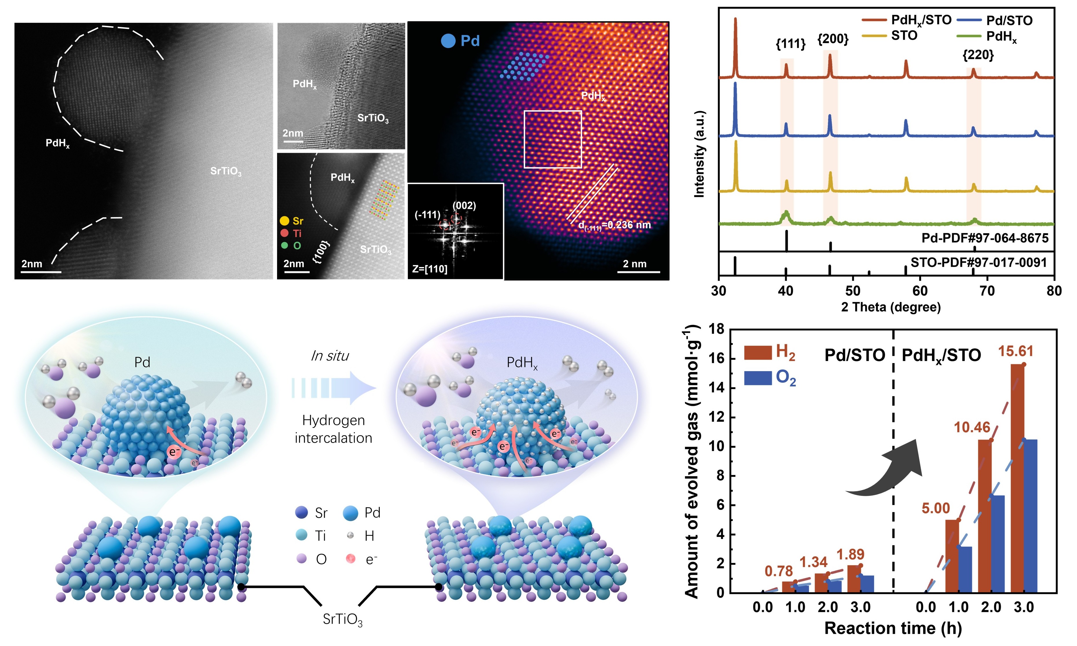 针对这一关键问题,我校yl23455永利集团清洁能源材料与器件团队选取钛酸锶(SrTiO3, STO)作为半导体光催化材料,通过在STO表面定向锚定晶格匹配的Pd纳米团簇作为助催化剂,进一步通过原位注氢手段可控构建出PdHx活性结构。PdHx/STO的光催化体系展现出优异的光分解纯水制氢性能,其氢气析出速率高达5 mmol·g-1·h-1,较未注氢前的Pd/STO提升6.4倍。