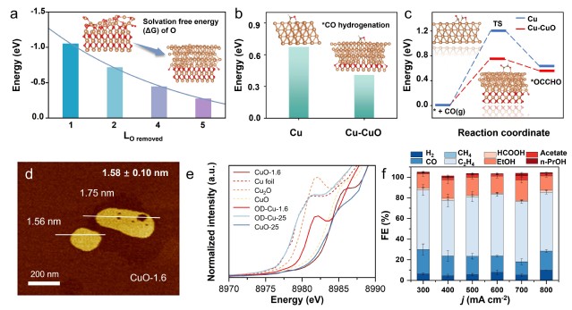 针对这一关键问题,我校yl23455永利集团清洁能源材料与器件团队以CuO纳米片为模型材料,探究了厚度对OD-Cu残余氧的影响。当CuO纳米片厚度降至1.6 nm时,氧保留能力显著增强,在300-700 mA cm-2的宽电流密度范围内实现了约80%的C2+产物法拉第效率(FE),并在700 mA cm-2条件下达到84.6%的C2+产物选择性峰值。研究团队通过对CuO纳米片材料进行系统的结构研究,阐明了纳米片厚度对调控OD-Cu残留氧的关键作用:分子动力学模拟表明,随着氧脱除层数增加,工况还原过程中Cu-CuO结构的底层氧原子难以向外部扩散,这种特性有效促进了*CHO中间体形成以及后续的*OC-CHO偶联反应,进而提升了C2+产物选择性;结合结构表征、电化学分析以及相关原位表征结果,发现重构堆叠的Cu-CuO纳米片结构具有强氧保留能力和易再氧化的金属铜位点,这种协同效应优化了OH-吸附和*CO富集,显著促进了C2+产物生成。该研究工作不仅为设计高效OD-Cu催化剂以实现CO2电还原制取多碳产物提供了重要理论依据,同时揭示了氧保留效应在CO2电还原反应过程对催化性能的影响机制。