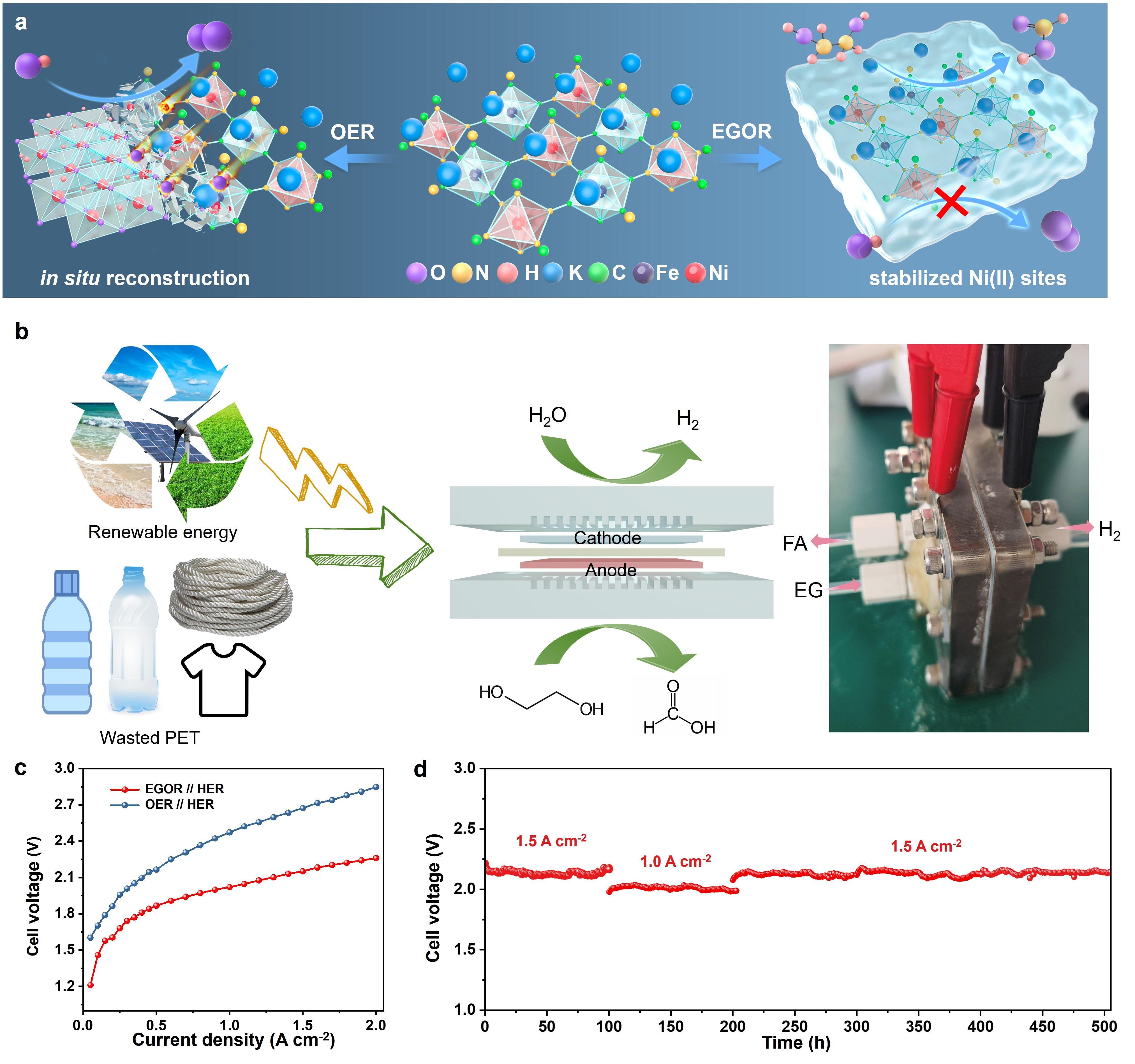 针对这一关键问题,我校yl23455永利集团清洁能源材料与器件团队在普鲁士蓝类似物(NiFe-sc-PBA)体系中发现独特的低价Ni(II)活性位点,可以实现稳定、高效、高选择性的乙二醇氧化(EGOR)过程。系列原位/非原位表征结合理论计算证明了Ni(II)位点在EGOR反应过程中的稳定性,即无需重构形成高价NiOOH活性物质便可以发生高选择性EGOR催化过程。分子动力学模拟进一步表明了“催化剂-反应物相互作用关系”在醇类氧化中的重要性:EG分子倾向于聚集在NiFe-sc-PBA表面,重塑的氢键网络阻止电解质中羟基的吸附氧,从而有效避免碱性溶液中羟基诱导的结构重构。所设计的Ni(II)活性中心在EGOR反应中展现出了优异的催化活性,在500和1000 mA cm⁻2的电流密度下,EGOR电位仅为1.484和1.625 V。为了进一步探究催化剂的实际应用潜力,对催化剂进行了膜电极器件组装,EGOR//HER体系相比与OER//HER体系显著降低了输入电压,在宽运行电流密度范围内(0.2到1.8 A cm-2)实现高甲酸法拉第效率(>90%)。组装的耦合制氢系统在1.0或1.5 A cm-2的电流密度下稳定运行了500小时,没有出现明显的性能衰减。本研究工作不仅为催化剂/反应物界面相互作用提供了全新的理解,也为设计高效、稳定的有机亲核小分子电氧化催化材料提供了重要借鉴。