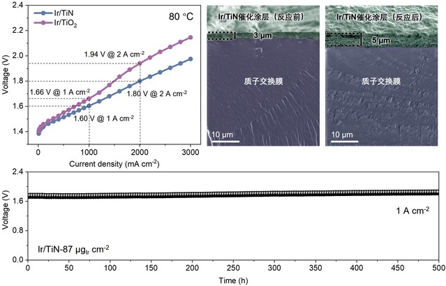 针对这一关键问题,我校yl23455永利集团清洁能源材料与器件团队以Ir/TiN负载型催化剂为模型材料,追踪了其在长期OER运行过程中的结构演化趋势,发现了一种载体原位溶出诱导的物种捕获效应,实现载体失稳反向强化催化剂稳定性的作用机制。在长期测试过程中,TiN载体逐渐氧化溶出,同时部分Ti物种被催化剂表面捕获,趋于形成表面Ti锚定的无定形IrOx稳定结构,这种载体溶出诱导的捕获效应有效抑制了活性非晶IrOx的进一步溶出。通过该策略构建的负载型催化剂可以在反应过程中将Ir的溶出减少89%,从而使性能衰减速率降低83%。这种材料结构在工况环境下的自适应溶出,也在催化层中引发了一种独特的自增厚效应:催化层自发趋于疏松多孔并维持一定厚度,从而避免了超薄催化涂层结构完整性、机械稳定性以及平面电导率差的问题。基于上述结构特点,在87 μgIr cm-2 的超低负载量下,Ir/TiN作为阳极催化电极构建的PEM电解槽仅需1.60 V的槽压即可达到1.0 A cm-2的电流密度,并保持稳定运行500 h没有明显性能衰减。该研究加深了非氧化物材料作为OER催化剂载体的工况构效关系理解,并为可控构建超薄催化电极结构提供了一种全新思路,进而有助于大幅降低PEM电解水技术对贵金属的高度依赖性。