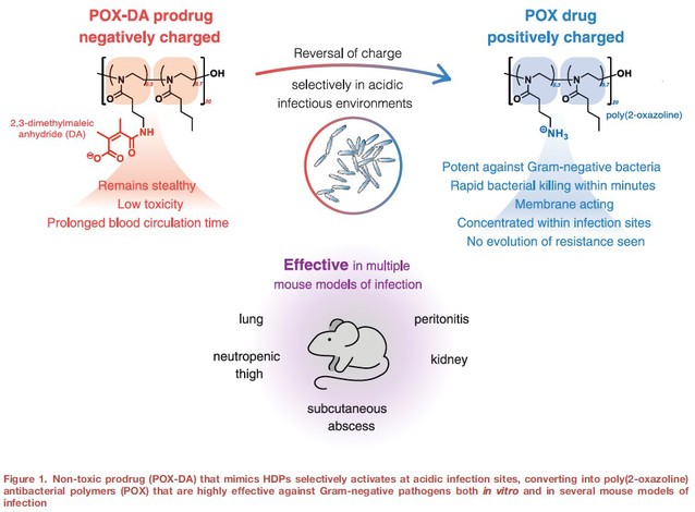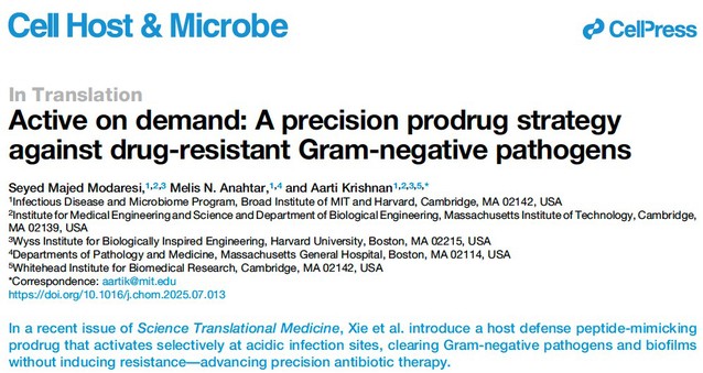 该研究报道了一种感染部位原位激活的宿主防御肽模拟前药设计策略,在实现“生理环境隐形、感染部位激活”响应性精准抗感染治疗的同时,还可将原本因毒性和生物利用度等问题受限的多肽类化合物转化为安全有效的候选药物分子,为开发具有体内应用潜力的新型抗感染药物提供了新思路。研究成果以“A host defense peptide-mimicking prodrug activated by drug-resistant Gram-negative bacterial infections”为题,以封面文章发表在ScienceTranslational Medicine(Sci. Transl. Med.2025, 17, 801, eadl4870)。该研究成果最近还被Nature Reviews Drug Discovery作为研究亮点报道(https://doi.org/10.1038/d41573-025-00118-7)。