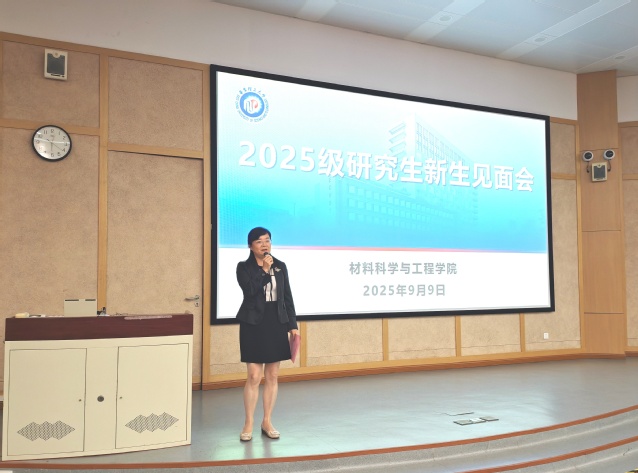 袁媛代表学院致辞,欢迎新同学加入材料学院大家庭。她谈到,学校响应国家战略需求,纵深推进现代化、数智化、绿色化、国际化“四化”发展战略和新能源新材料、大健康大安全“两新两大”发展布局,结合实例强调了材料学科对推动各领域创新发展的重要性。她对即将踏上科研征程的新生们有三点寄语:一要志存高远、心怀家国,将个人科研理想融入国家发展大局;二要勇于创新、敢于突破,在科研的道路上保持敏锐的洞察力和大胆的想象力;三要严谨笃实、厚积薄发,以一丝不苟的精神面对科研中的每一个细节。