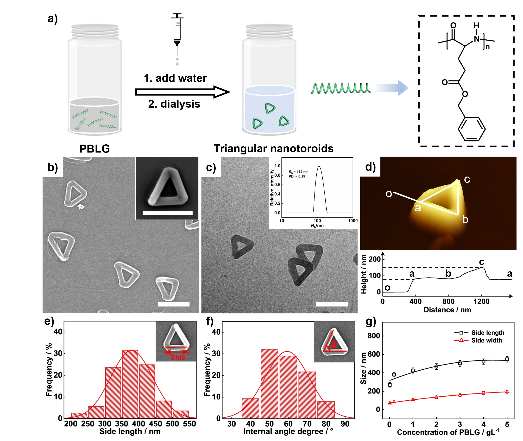 针对这一挑战,研究团队通过聚肽均聚物聚(γ-苄基-L-谷氨酸酯)(PBLG)的溶液自组装制备得到了三角形纳米环。通过三角形纳米环边长和角度的统计,其近似于一个等边三角形。三角形纳米环并非平面结构,其边的高度变化表明了该结构具有右手手性。三角形纳米环的手性与PBLG聚合物的手性特性有关。在类似的实验条件下,PBDG(PBLG的对映体)可以形成具有左手性的三角形纳米环。